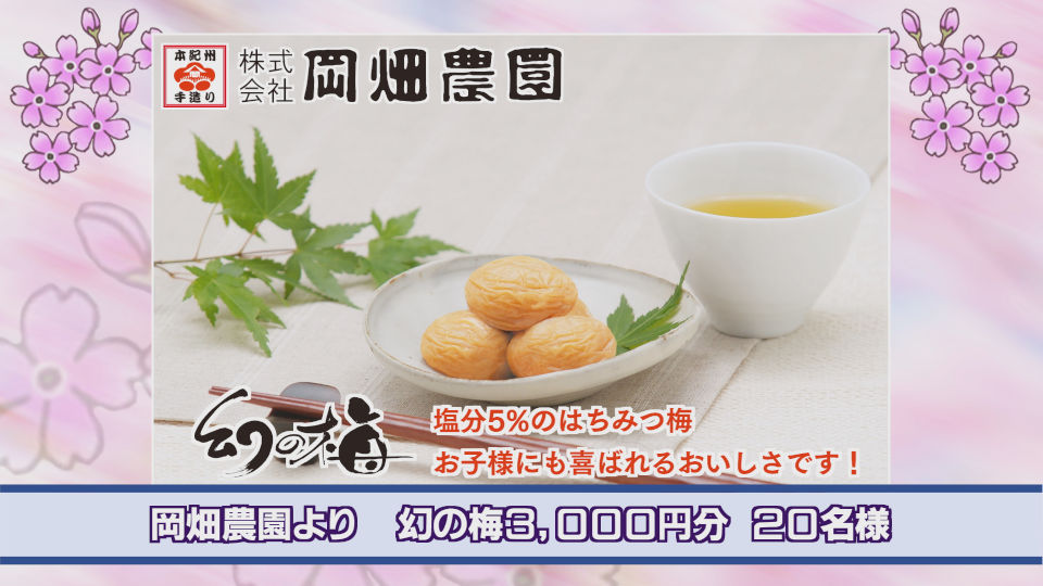 とちぎテレビ番組のご案内TV PROGRAM GUIDE ハルプレ とちテレ春のプレゼントキャンペーン 番組名:ハルプレ とちテレ春のプレゼントキャンペーン 今回も豪華プレゼントをご用意!どしどしご応募ください! 紀州産A級品のみを使用したまろやかで上品な甘さのはちみつ梅干。岡畑農園より「幻の梅3000円分」を20名様に! 応募期間:3月1日(日)〜3月31日(火) ▲応募はこちら 番組一覧へ