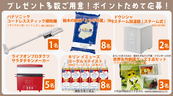 期間中とちぎテレビを視聴すると1分につき1ポイントが自動的に加算されます。リモコンのdボタンを押してデータ放送画面を開き、そのポイントを使ってプレゼントに応募してください。