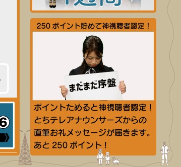 250ポイント貯めた視聴者には、とちテレアナウンサーズ(飯島誠・堀内えみり・藤井智恵実・桐原小真季)から直筆感謝状をもれなくお届け!ポイントがたまったら、データ放送画面のQRコードからお申込みください。