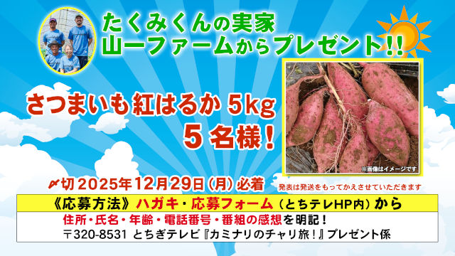 カミナリのチャリ旅!たくみくんの実家 山一ファームからさつまいも紅はるか5kgを5名様にプレゼント!